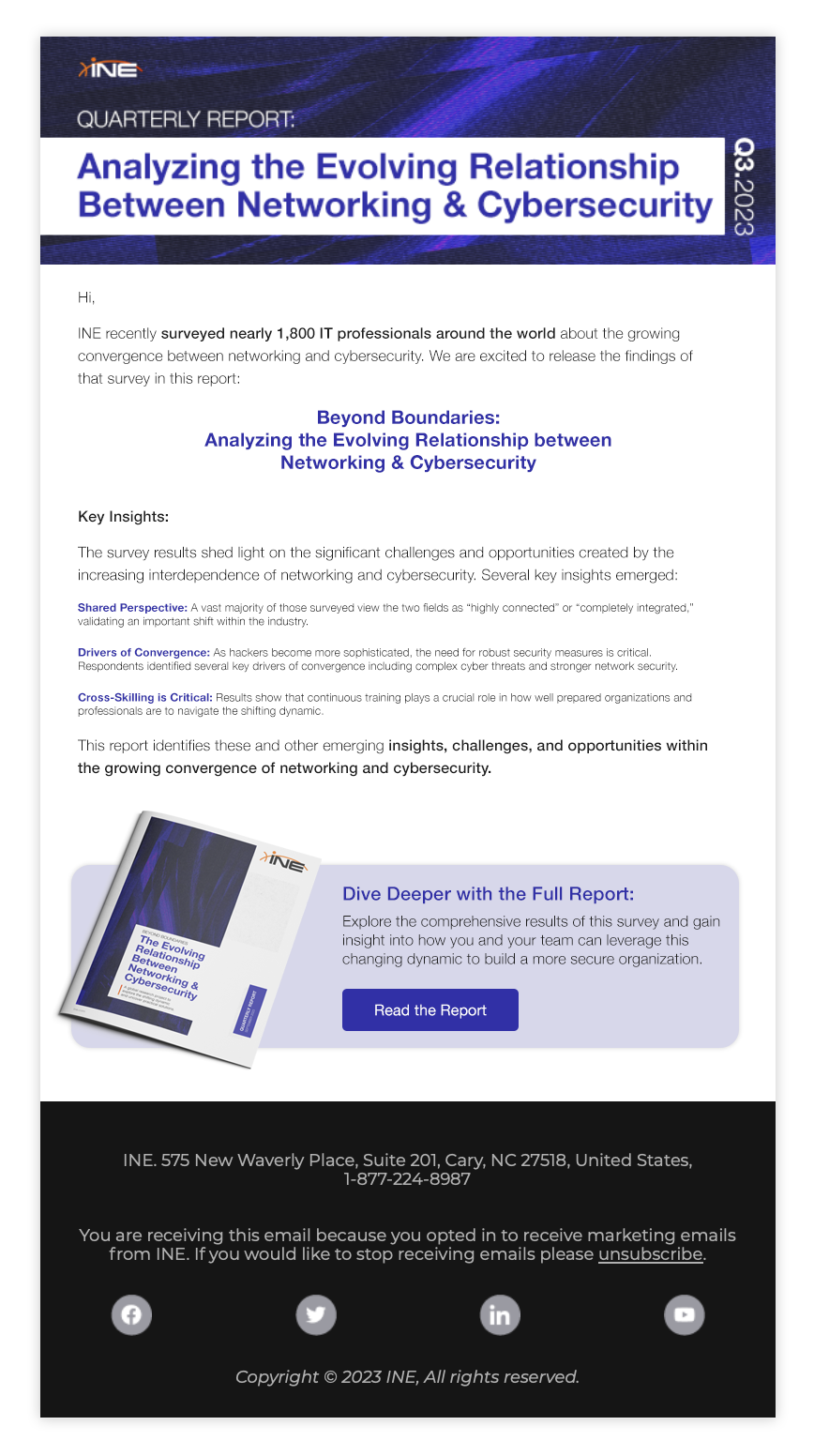 The INE Quarterly Report campaign emphasizes INE’s leadership in IT training at the intersection of cybersecurity and networking by highlighting the importance of these connected areas in today’s IT landscape.